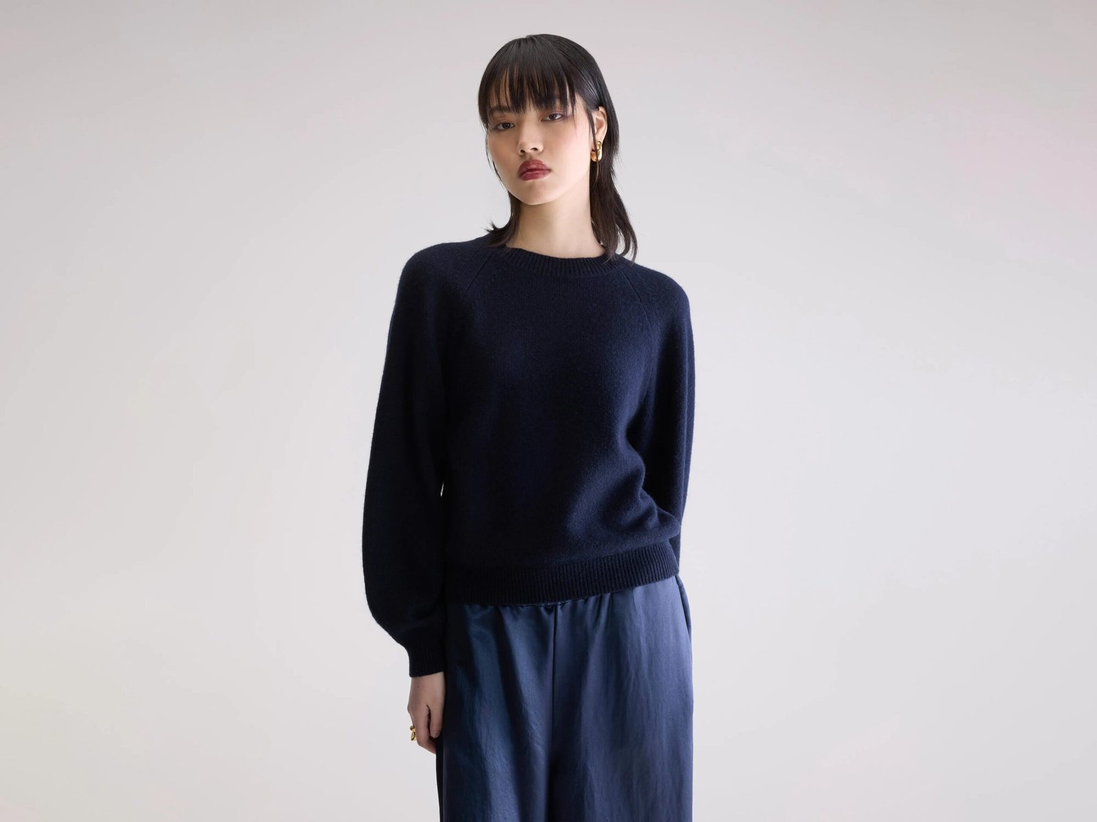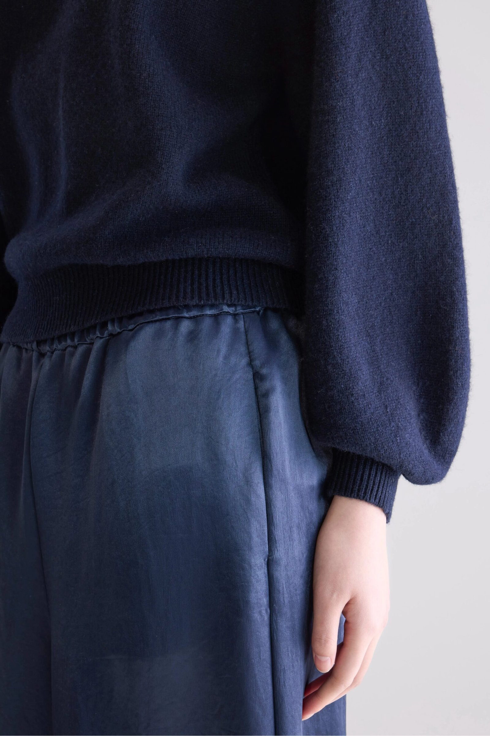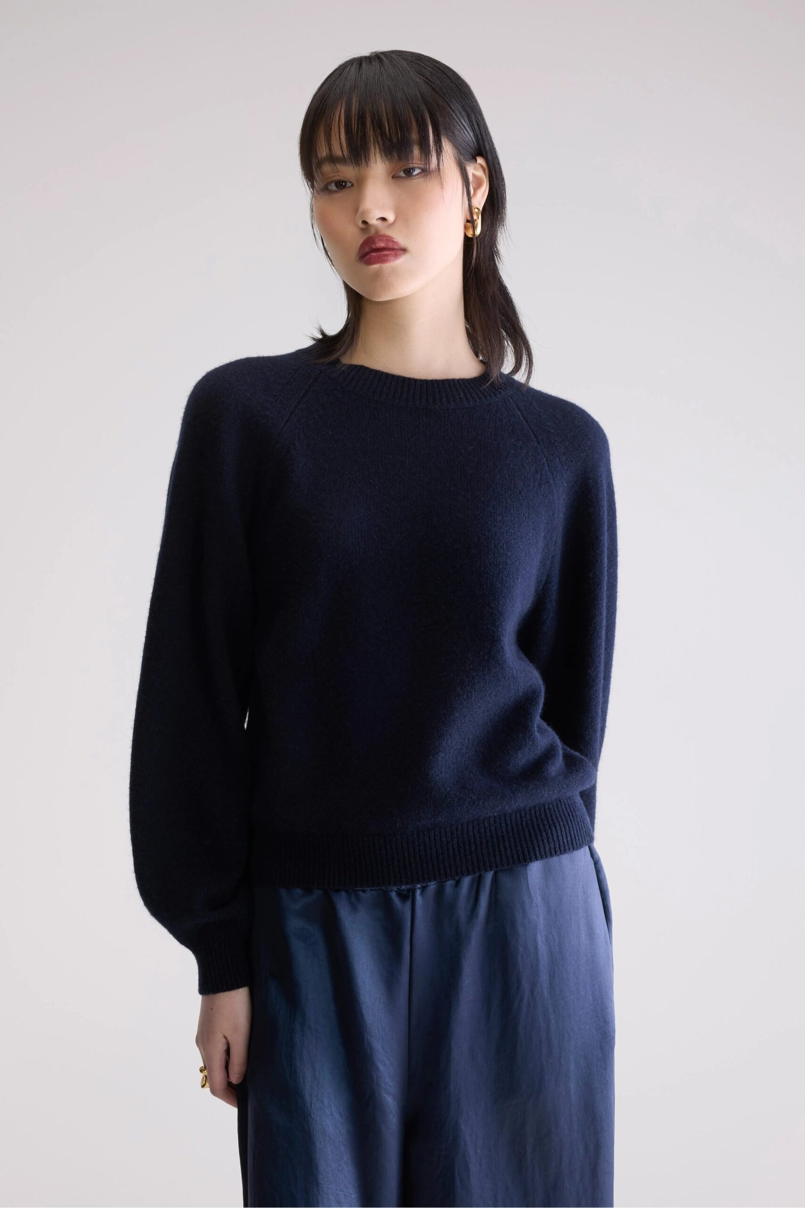 Soft navy blue knit sweater. featuring a crew neckline and large voluminous sleaves.
