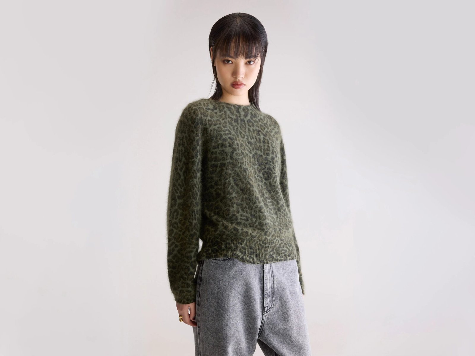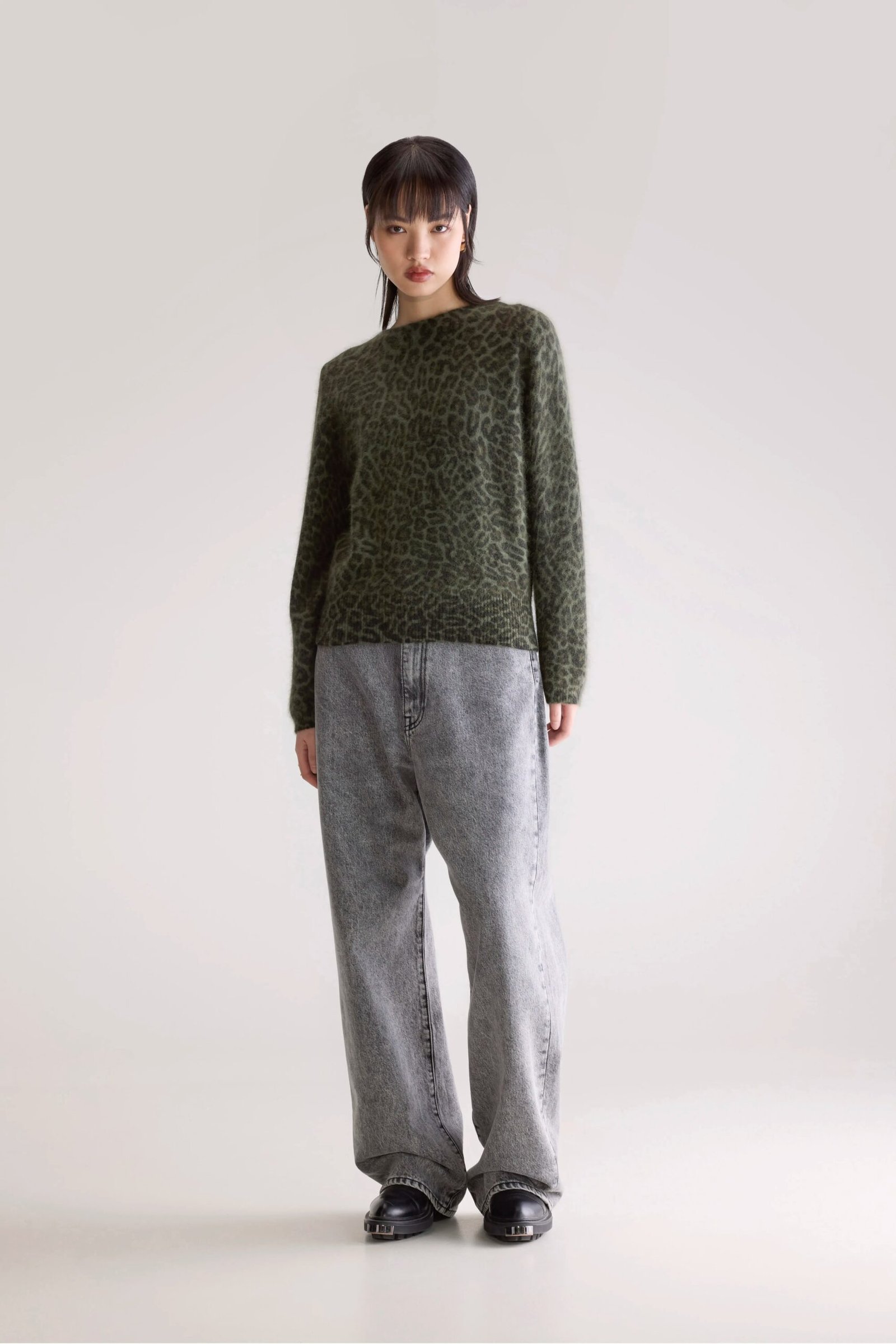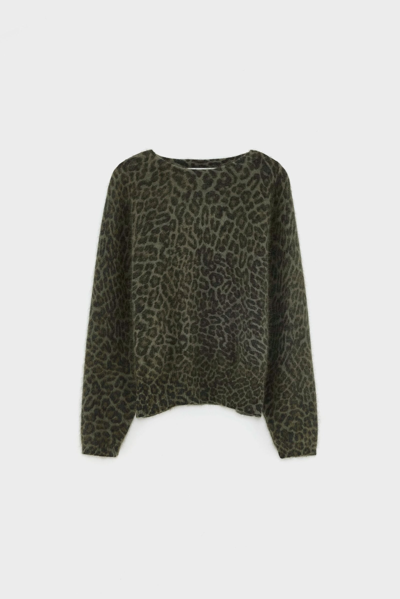 Oversized leopard print sweater in a soft green angora blend.