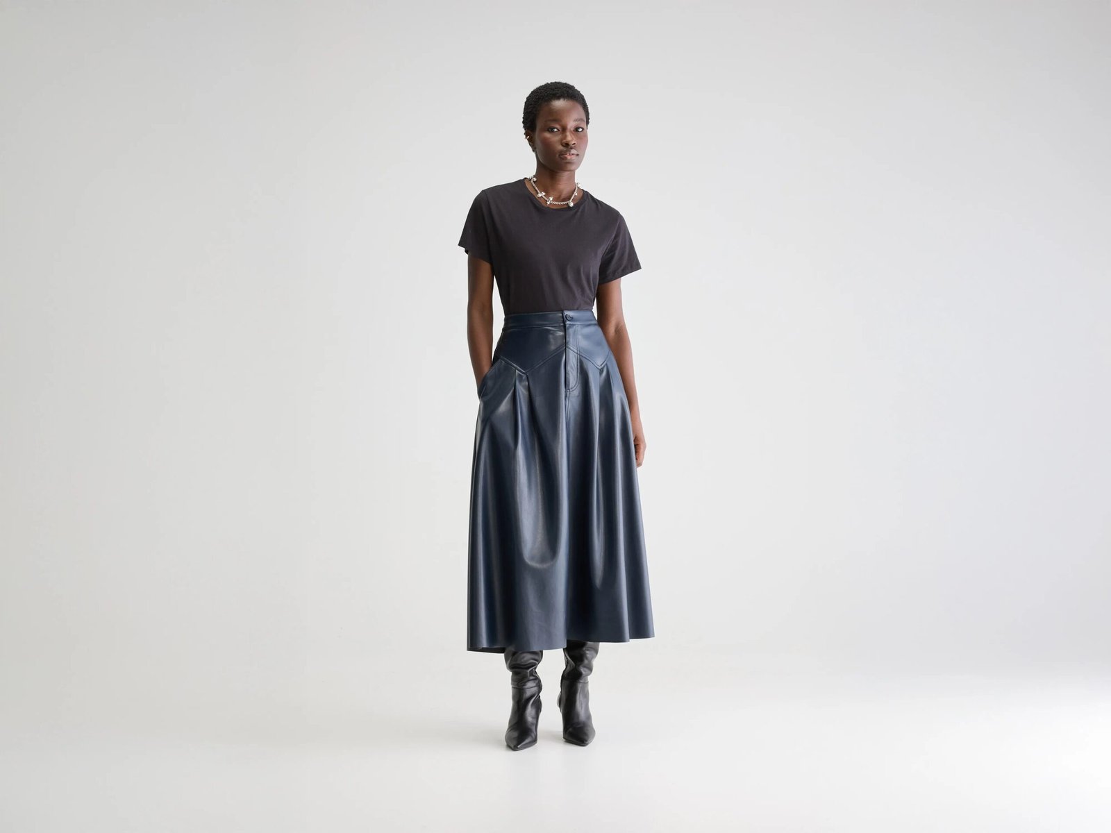 Flared mid skirt with Western-inspired details on the waist and front pleats made from dark blue fake leather.