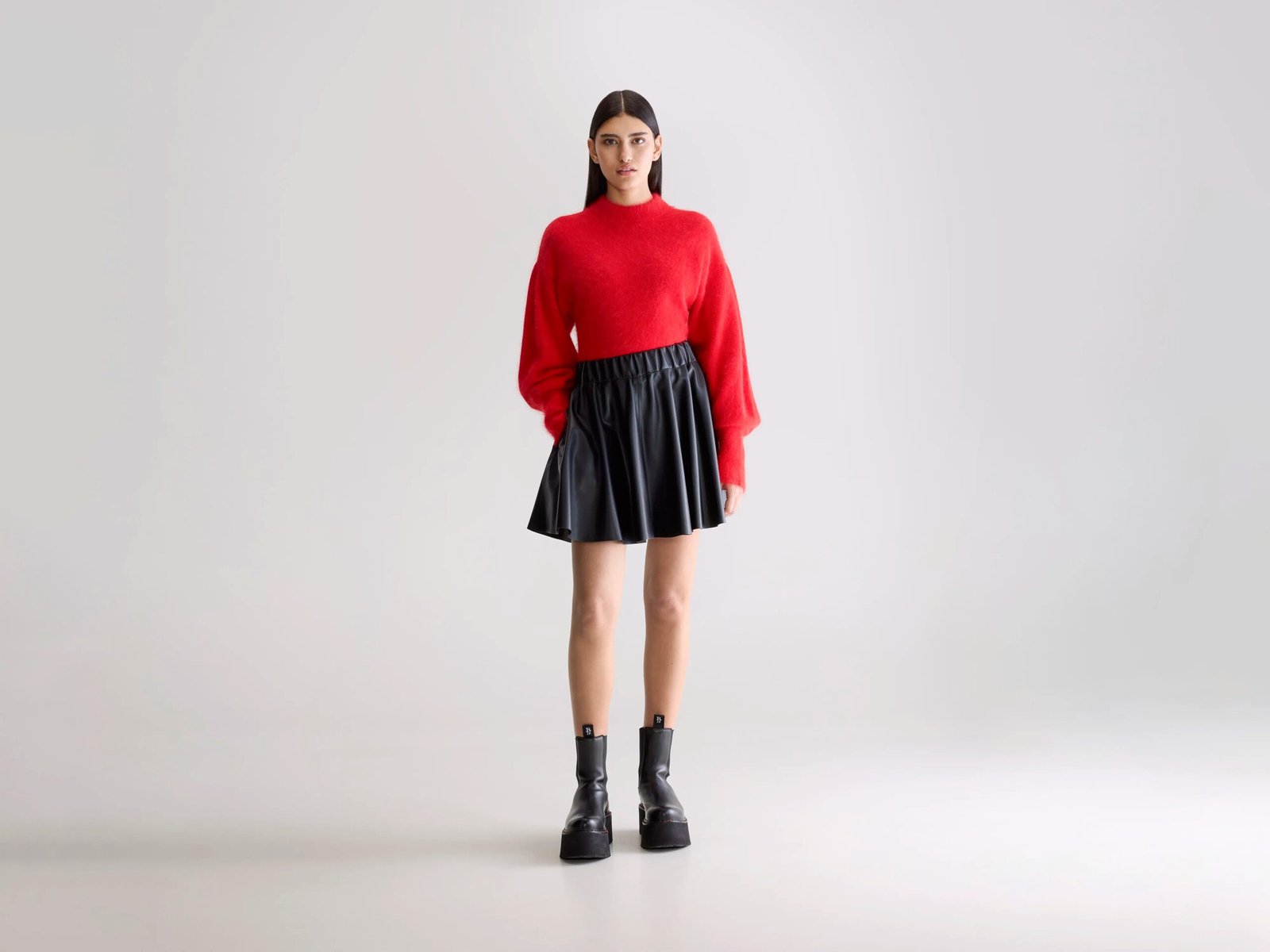 Black mini skirt in a suptle faux leather with a elasticated waistband and voluminous silouhette.