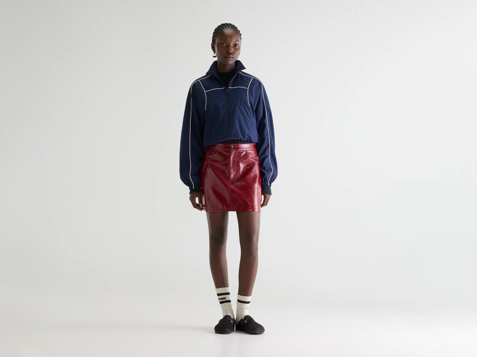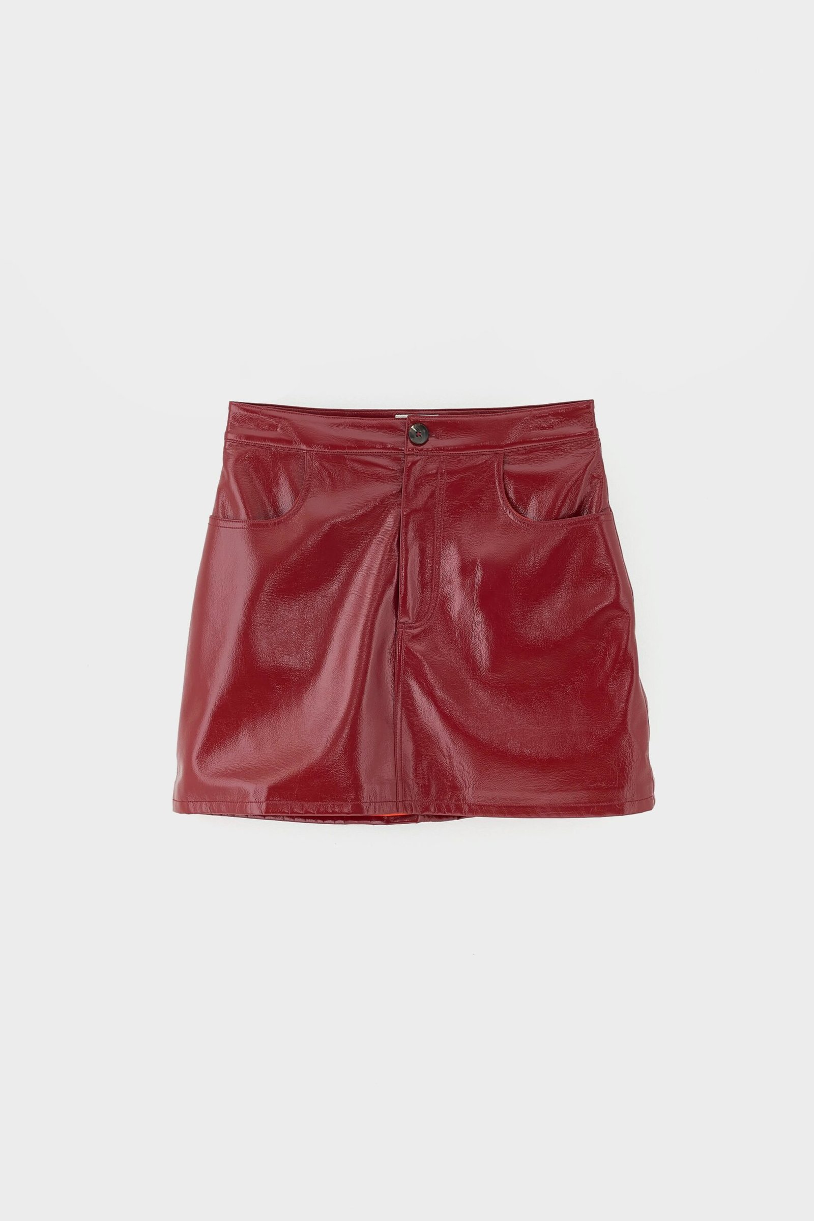 Faux-leather mini skirt with an A-line shape and 5-pocket style made from vinyl-like fabric in cherry red.
