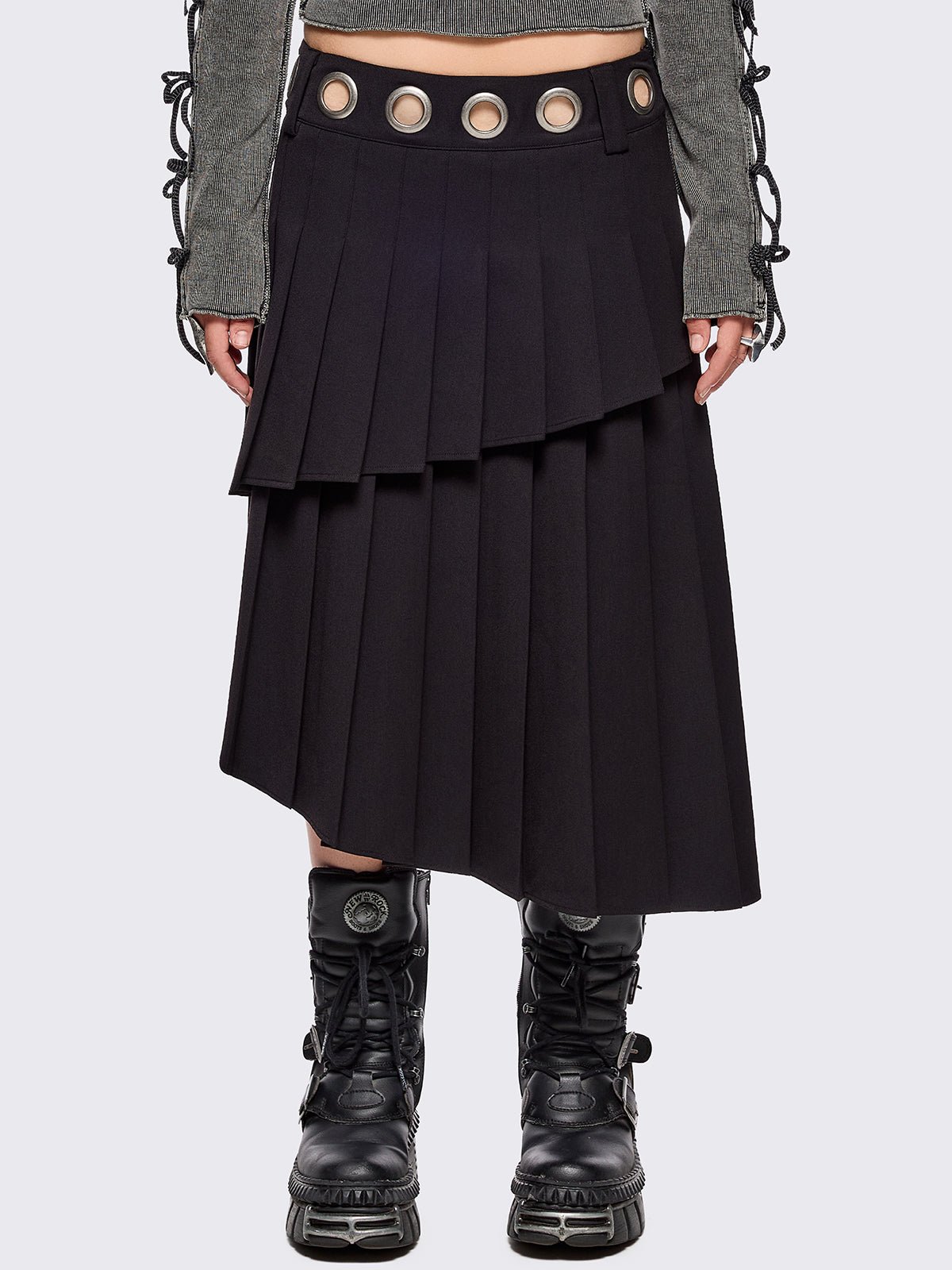 - Black pleated asymmetric midi skirt